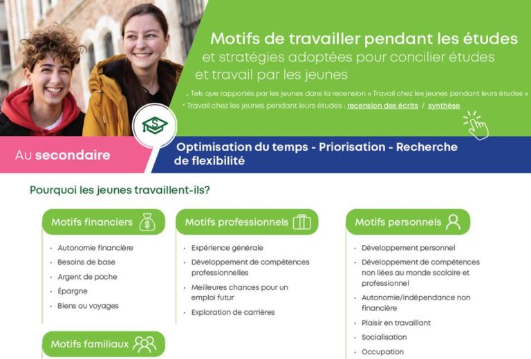 Ces infographies rassemblent des informations tirées de la recension des écrits Travail chez les jeunes pendant leurs études (Supeno, Longo et Lapointe-Garant, 2024).